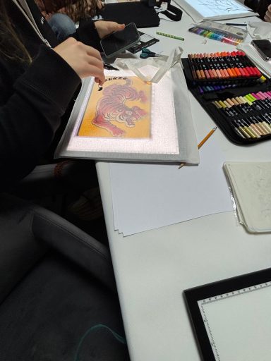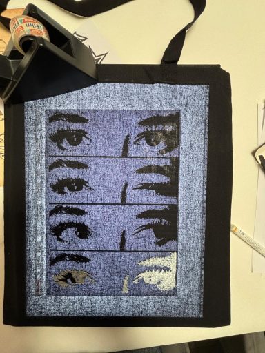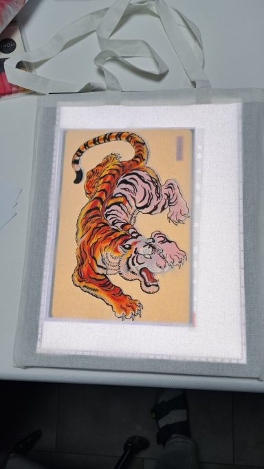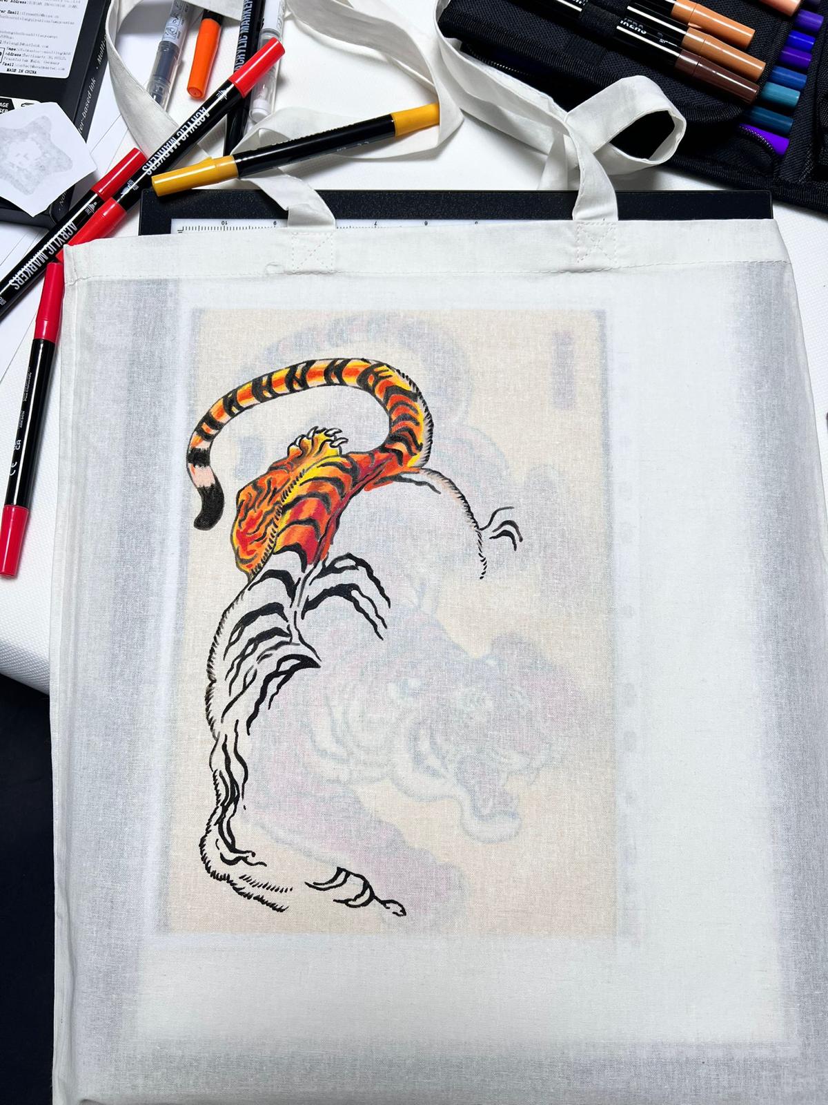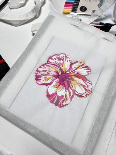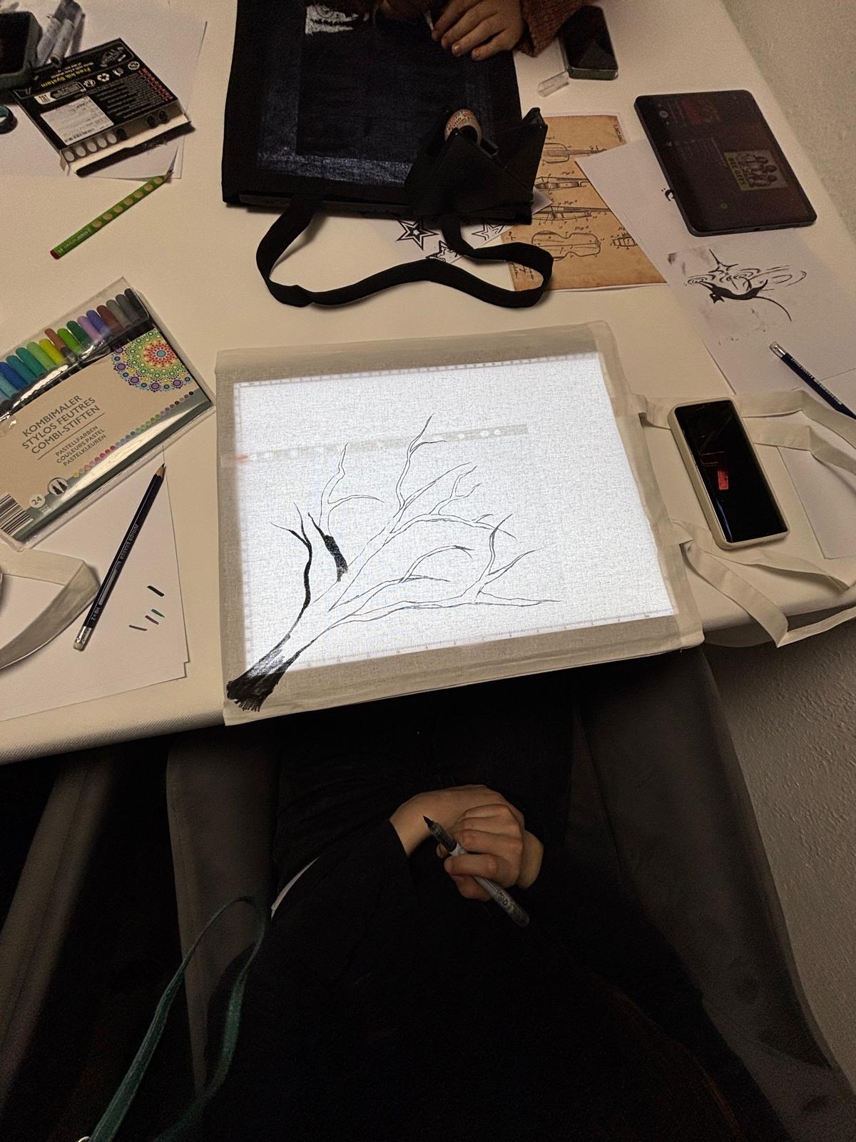 Die Vorlage wird auf das Lichtpad gelegt, die Tasche wird darüber gelegt und dann wird die Tasche mit Hilfe der Vorlage bemalt.